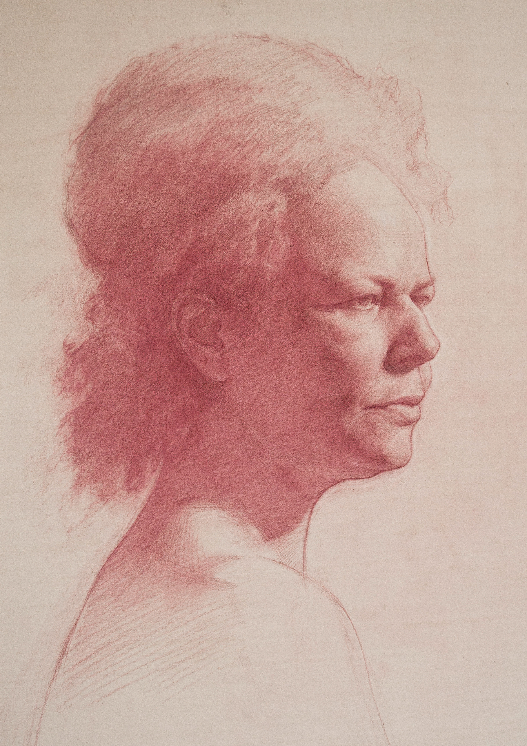 Portrait of Regina, Red chalk on toned paper. A queenly model, as her name so beautifully implies, Regina had a constant and powerful gaze that appropriately belongs to one who sits the dais of the studio.